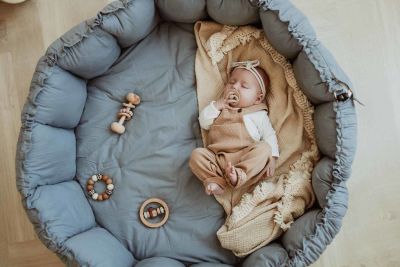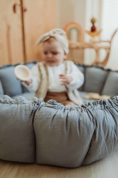 Crafted from GOTS-certified organic cotton and padded with GRS-certified recycled PET, coco offers a safe, cushioned environment for tummy time, bonding, or gentle lounging. Pull the drawstrings to transform the playmat into a snug lounger with softly raised edges — a cozy nest that keeps favorite toys and little essentials neatly stored inside.