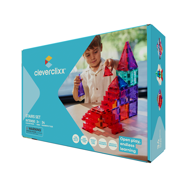 Take your builds to the next level with the Cleverclixx Stairs Set Intense! This 34-piece expansion set includes staircase elements and building pieces in rich, intense colours, perfectly compatible with your existing Cleverclixx collection. Children discover new ways to build, explore height differences, and create their own adventurous play structures. Ideal for making imaginative play worlds even more realistic and dynamic. Let their creativity reach new heights—literally!